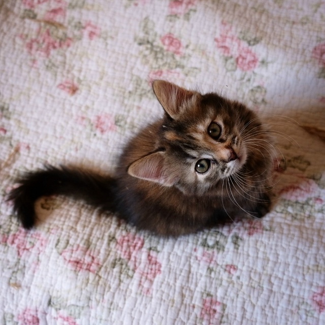 Чирипчик девочка, потому что мальчиков таких умных не бывает. Возраст примерно 2 месяца. С первого раза пошла в лоток. Изумительный характер, ласковая, любит играть и спать рядом с человеком. Хороший аппетит, активная как и положено котятам. На вид здорова. В ближайшее время посетит ветеринара.