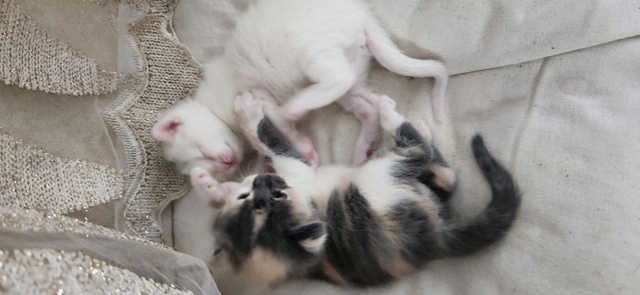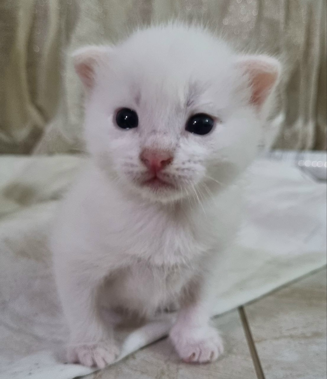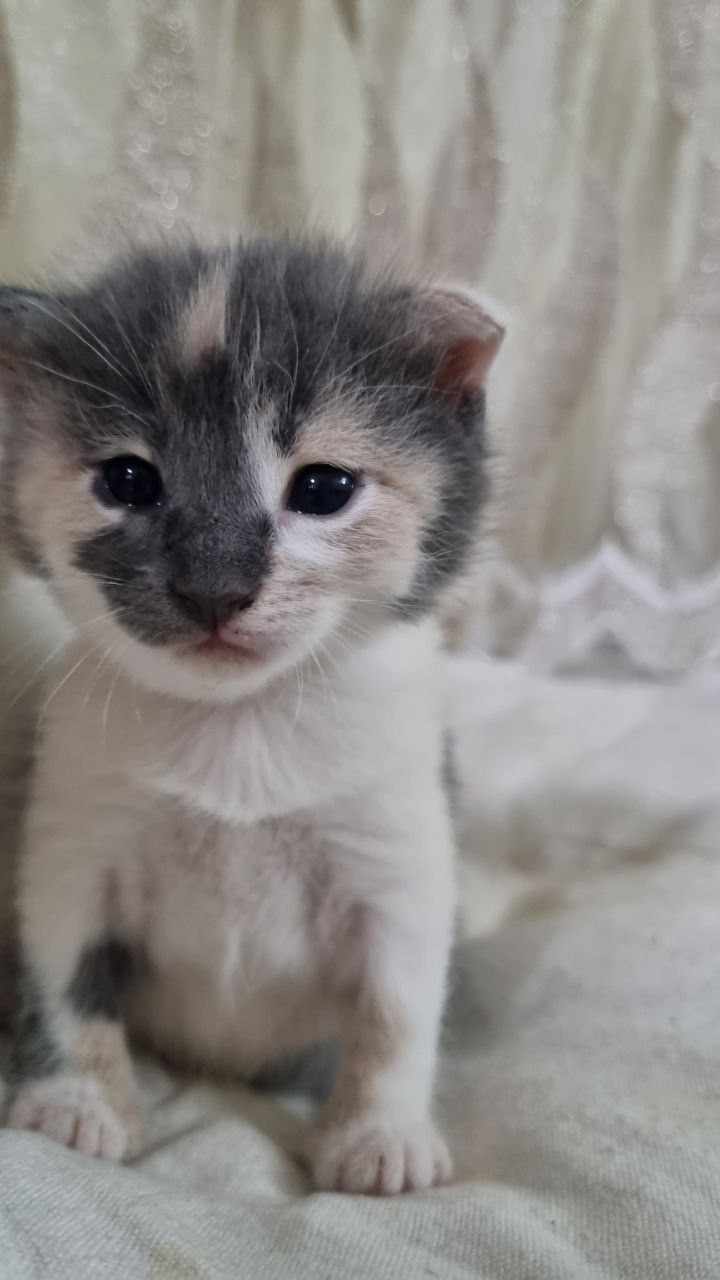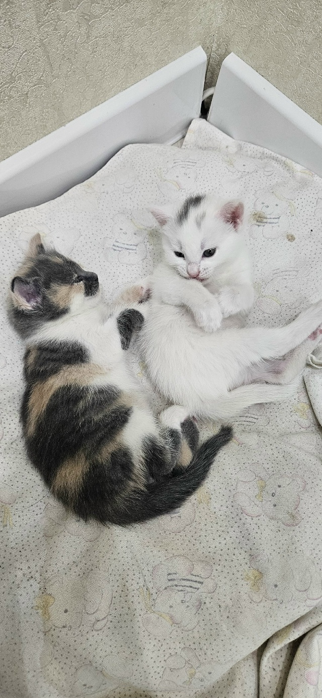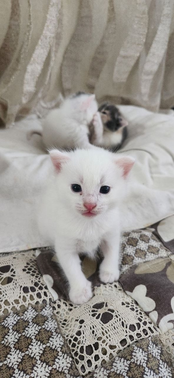 Отдадим в добрые руки котят, 1 котик(чисто белый) и 2 кошечки(трехцветная и белая с полоской чёрной на голове)