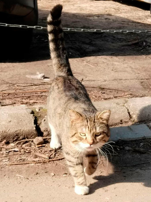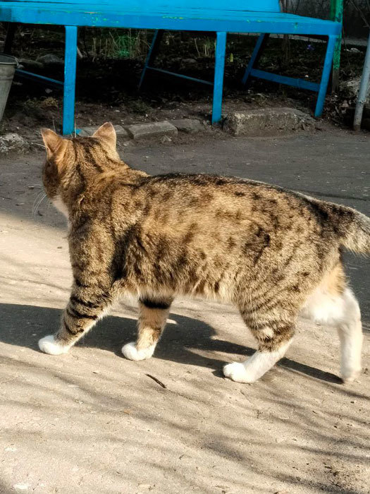 2. Полосато-пятнистый кот. Возраст примерно 2 года. Кот ручной. С кошками не всегда находит общий язык.