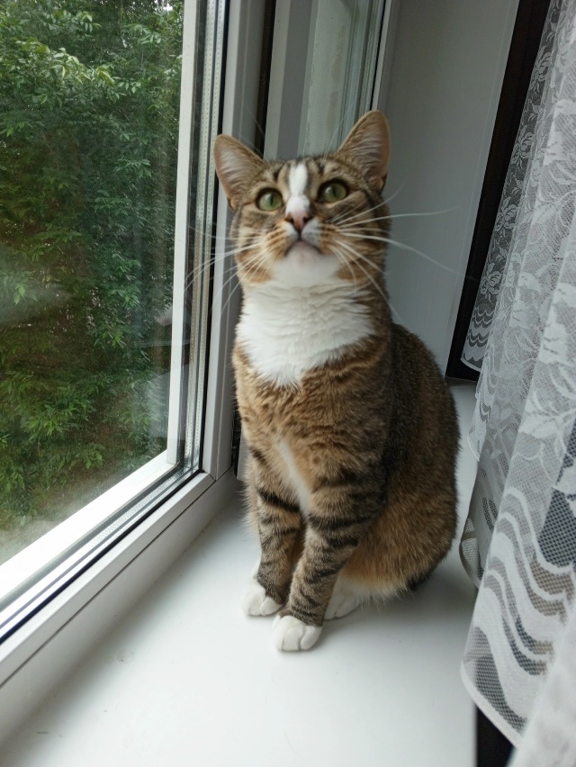 Облюбовал себе подоконничек и заглядывает в окошко почаще, чтобы не пропустить своих любимых мам-пап. Иногда правда и на другие дела отвлекается, поспать там, покушать, игрушечками взбодриться.