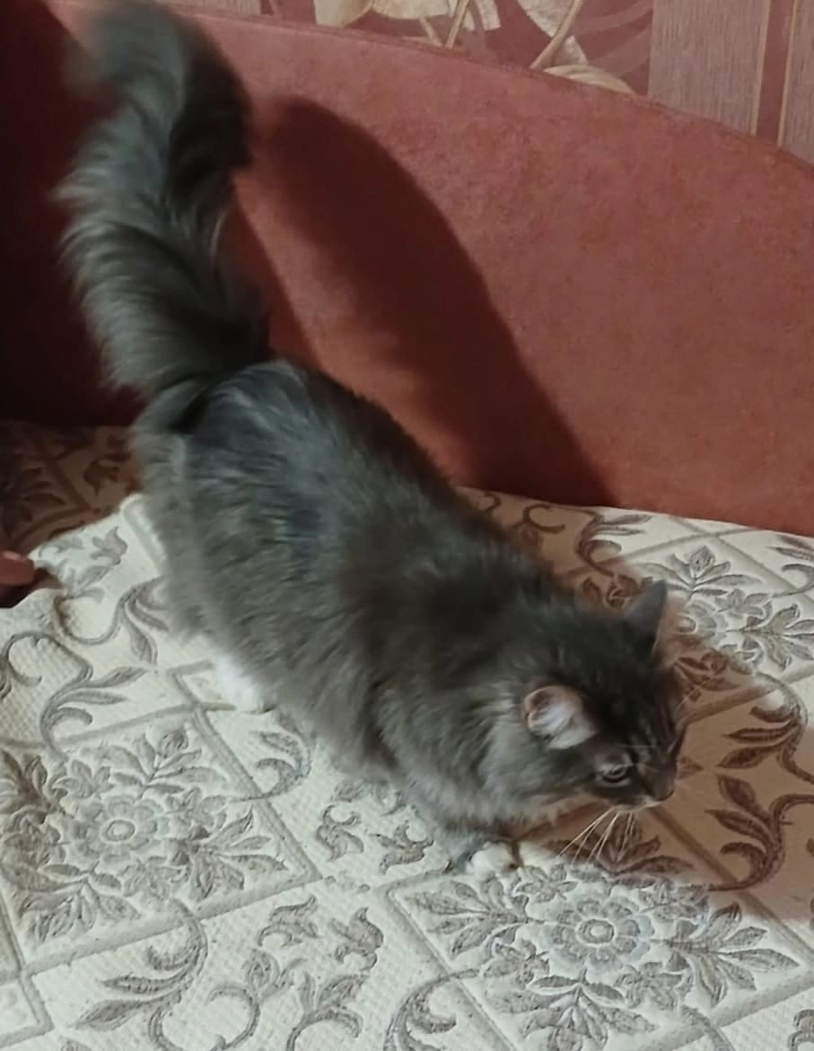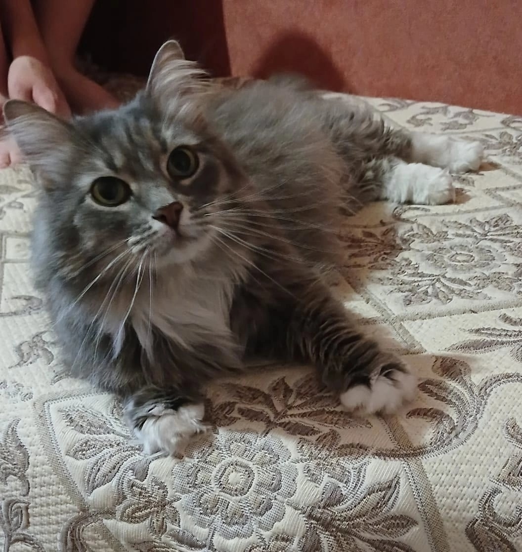 Очень ласковая к человеку, первым делом просится на ручки, а уж потом подойдёт к миске с едой. С сородичами выборочно, с собаки не ладит.
