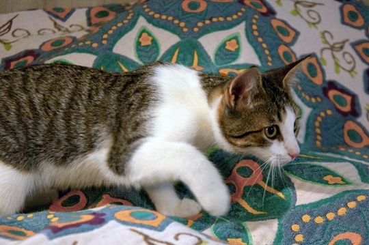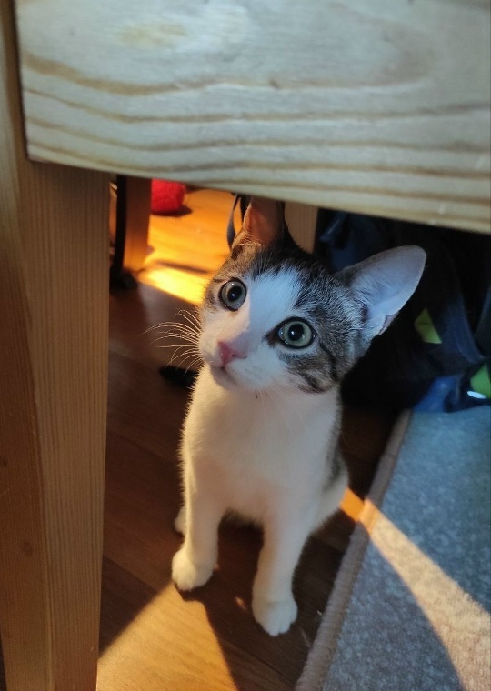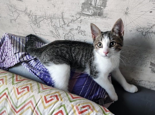 Ищет дом Шиллинг, бело-полосатый котёнок с очаровательным розовым носиком. Ему четыре месяца, и он некрупный, изящный.