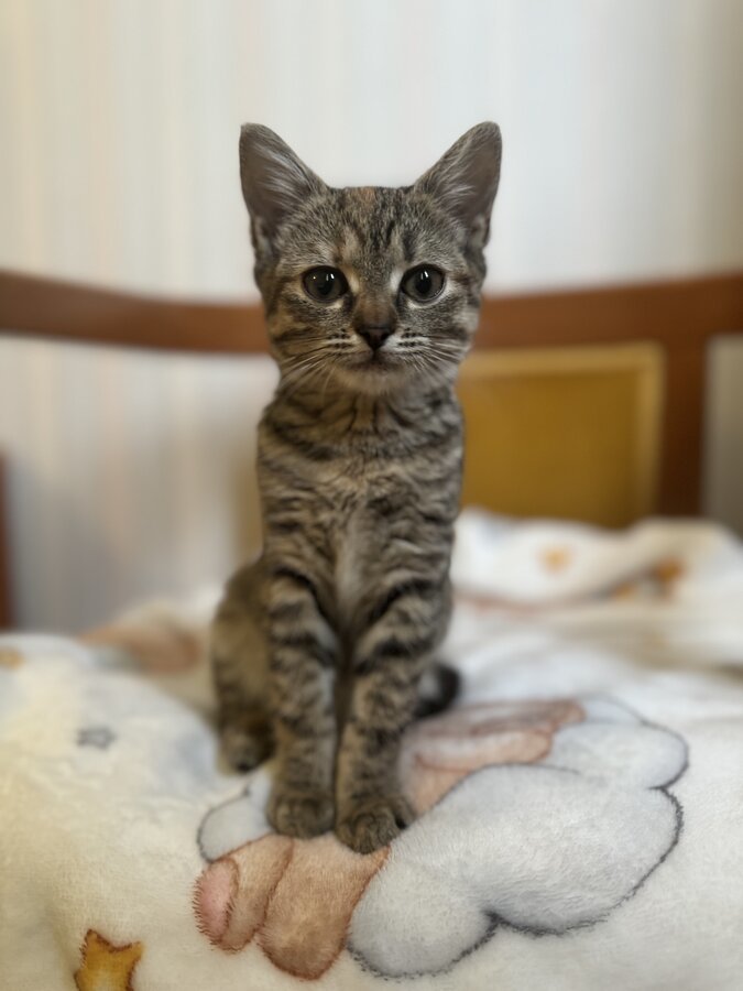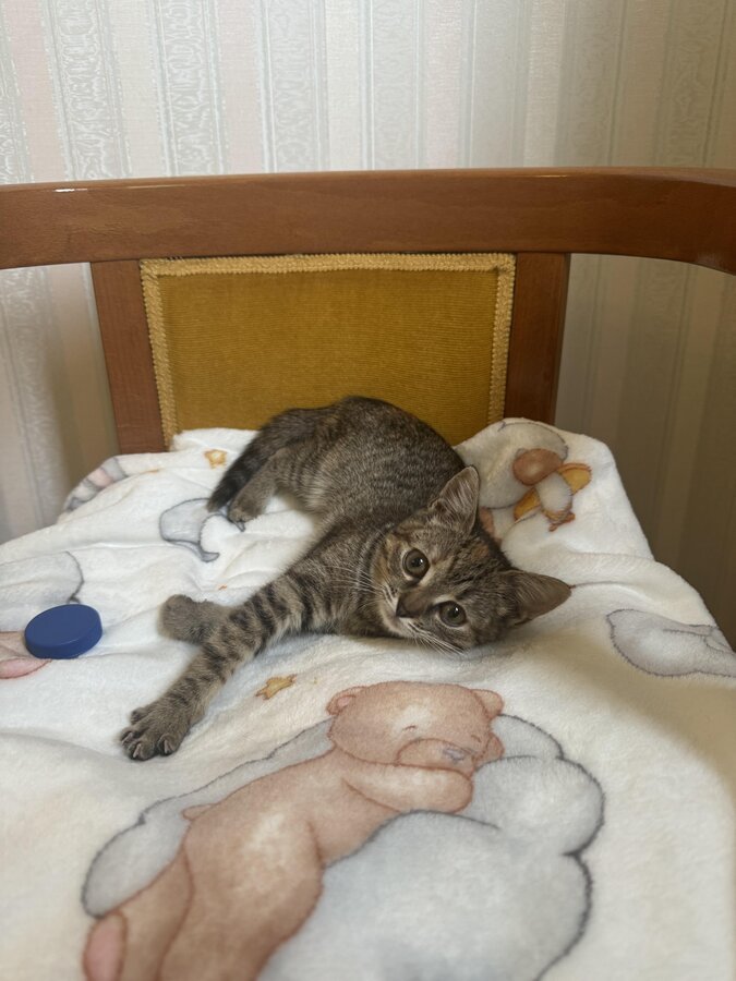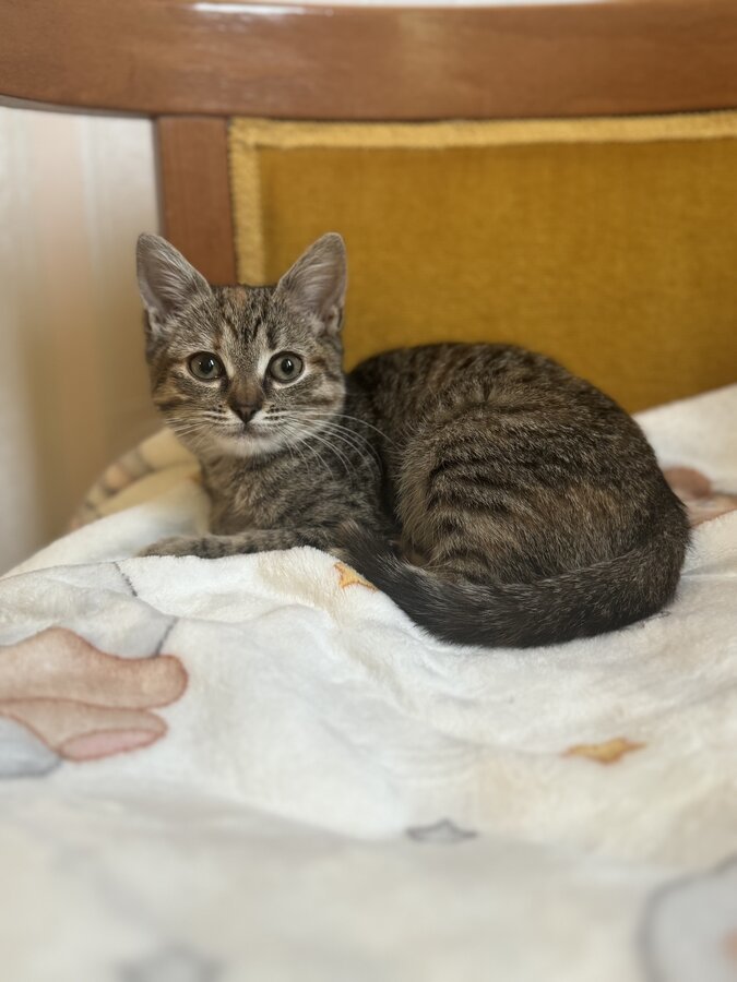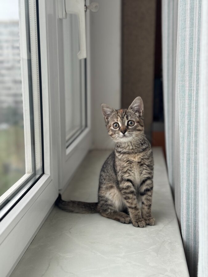 Я совсем крошка - всего килограмм счастья. У меня полосатая шёрстка с рыжим пятнышком на лбу и огромные глаза, которыми я стараюсь понять этот большой мир.