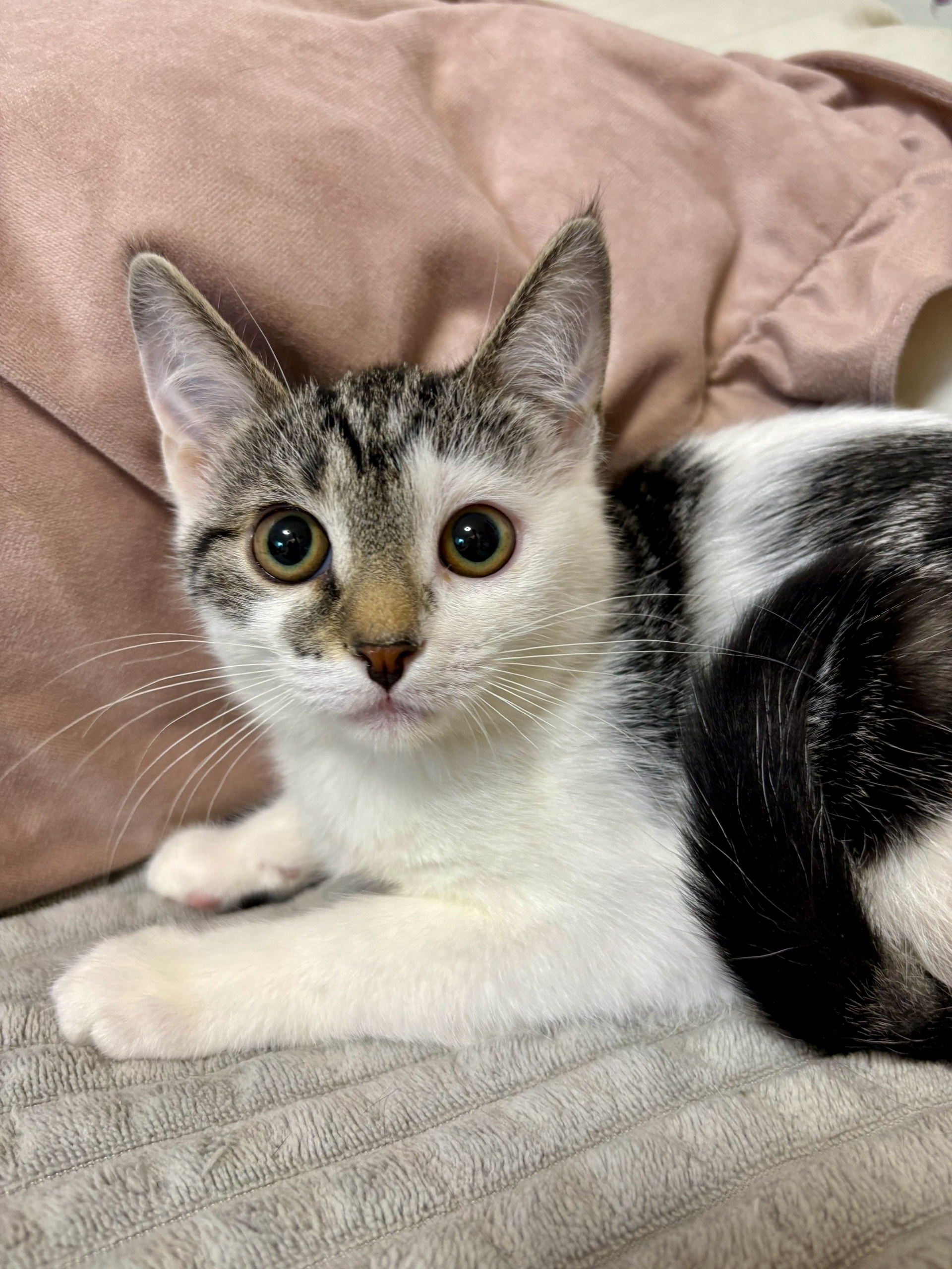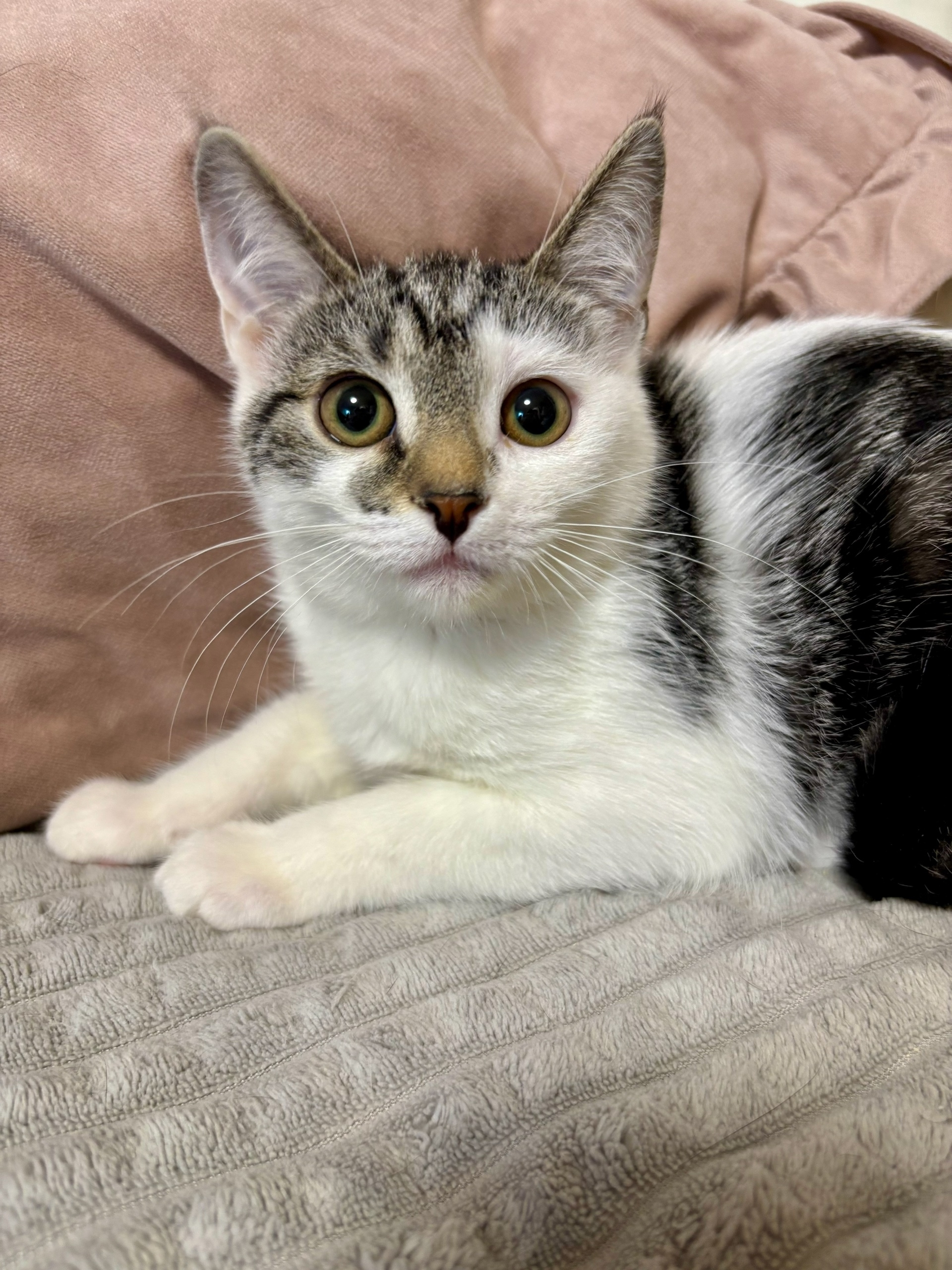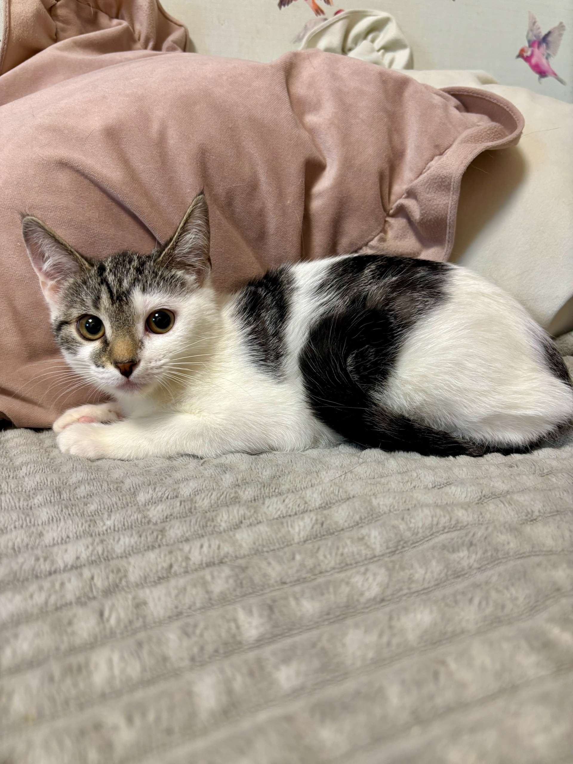 🤍Бело-серая девулька внимательная, смышлёная, наблюдает за кожаными и делает свои кошачьи выводы. Её доверие надо заслужить, маленькая, а уже знает себе цену.