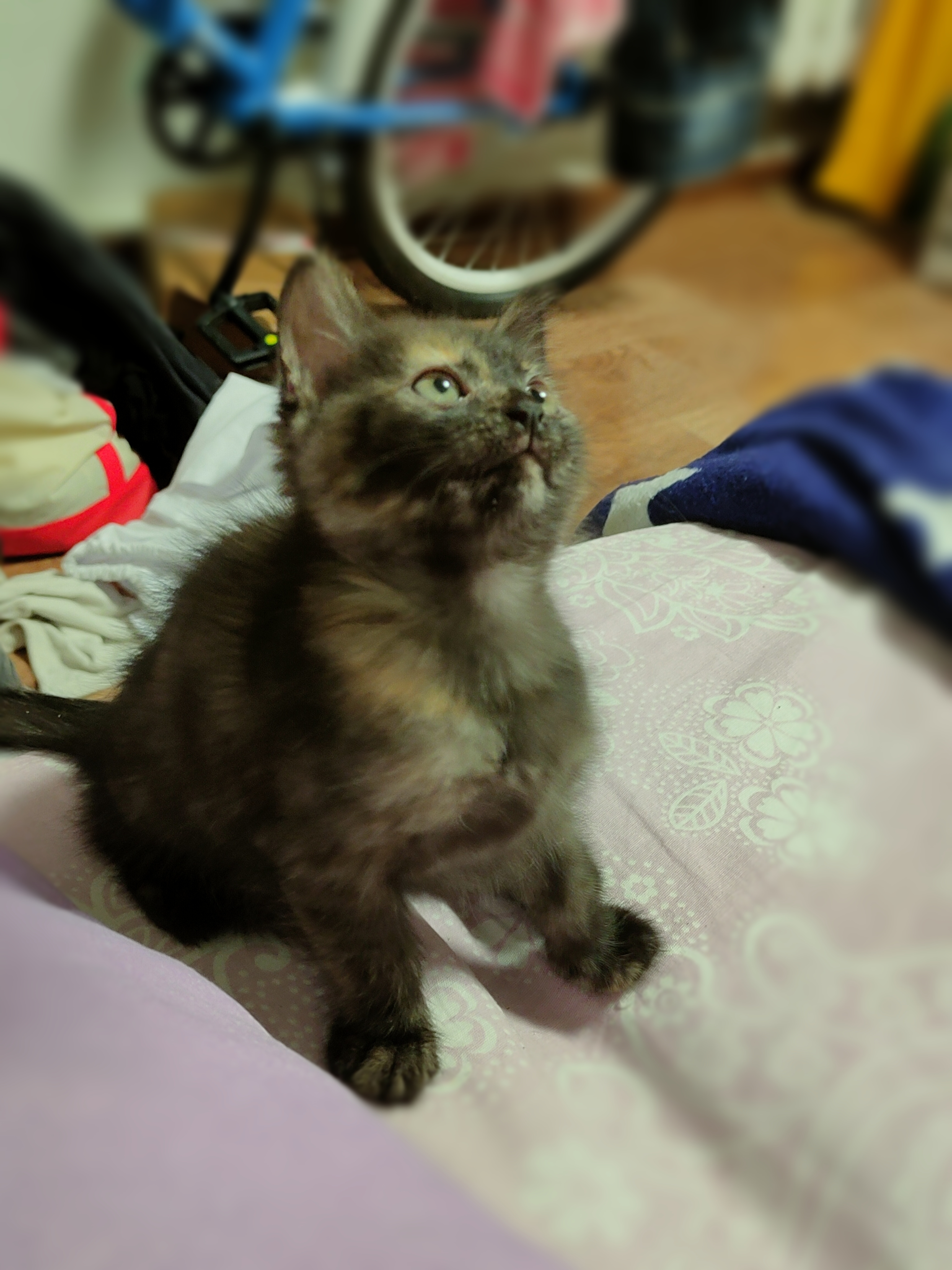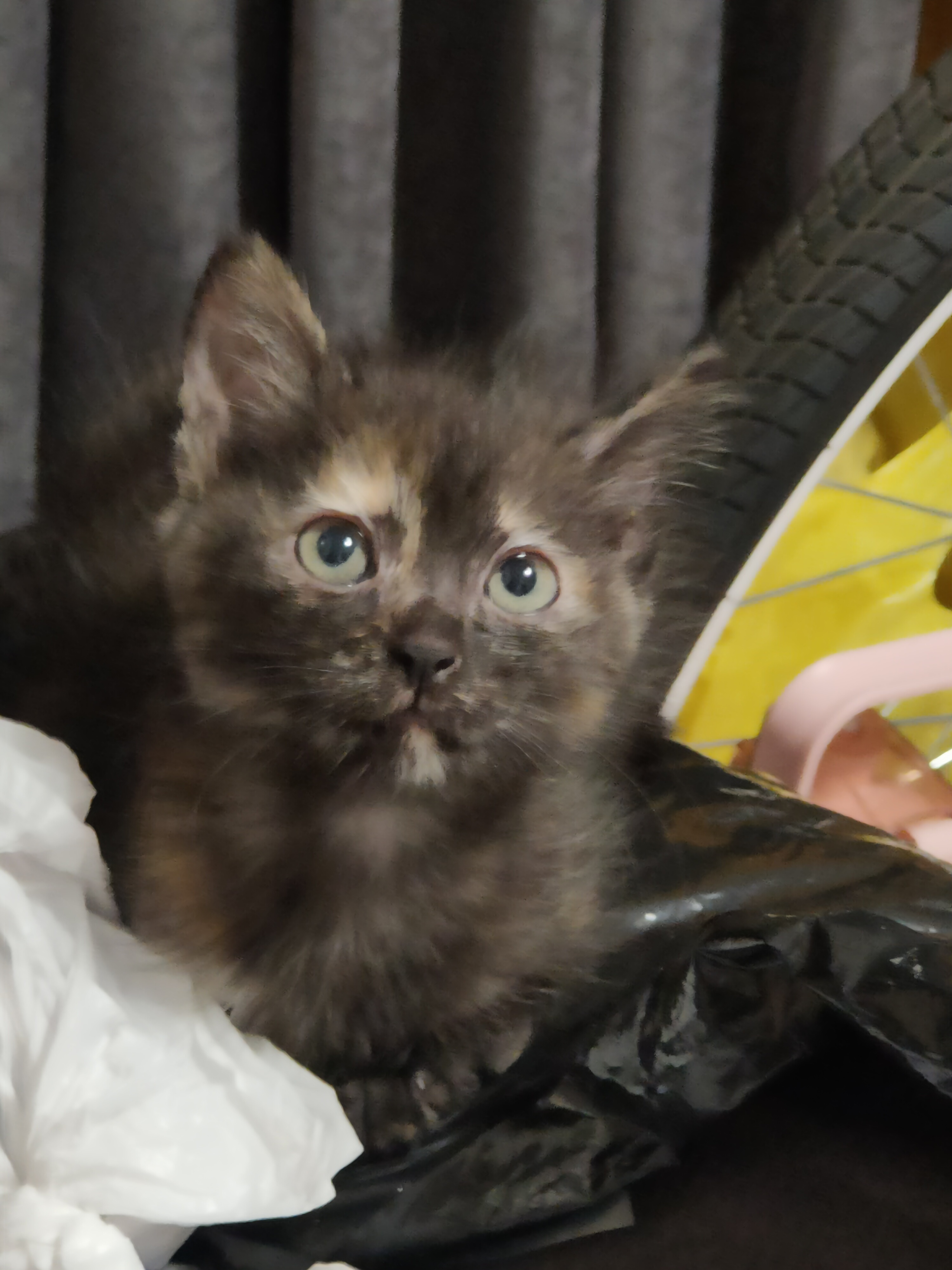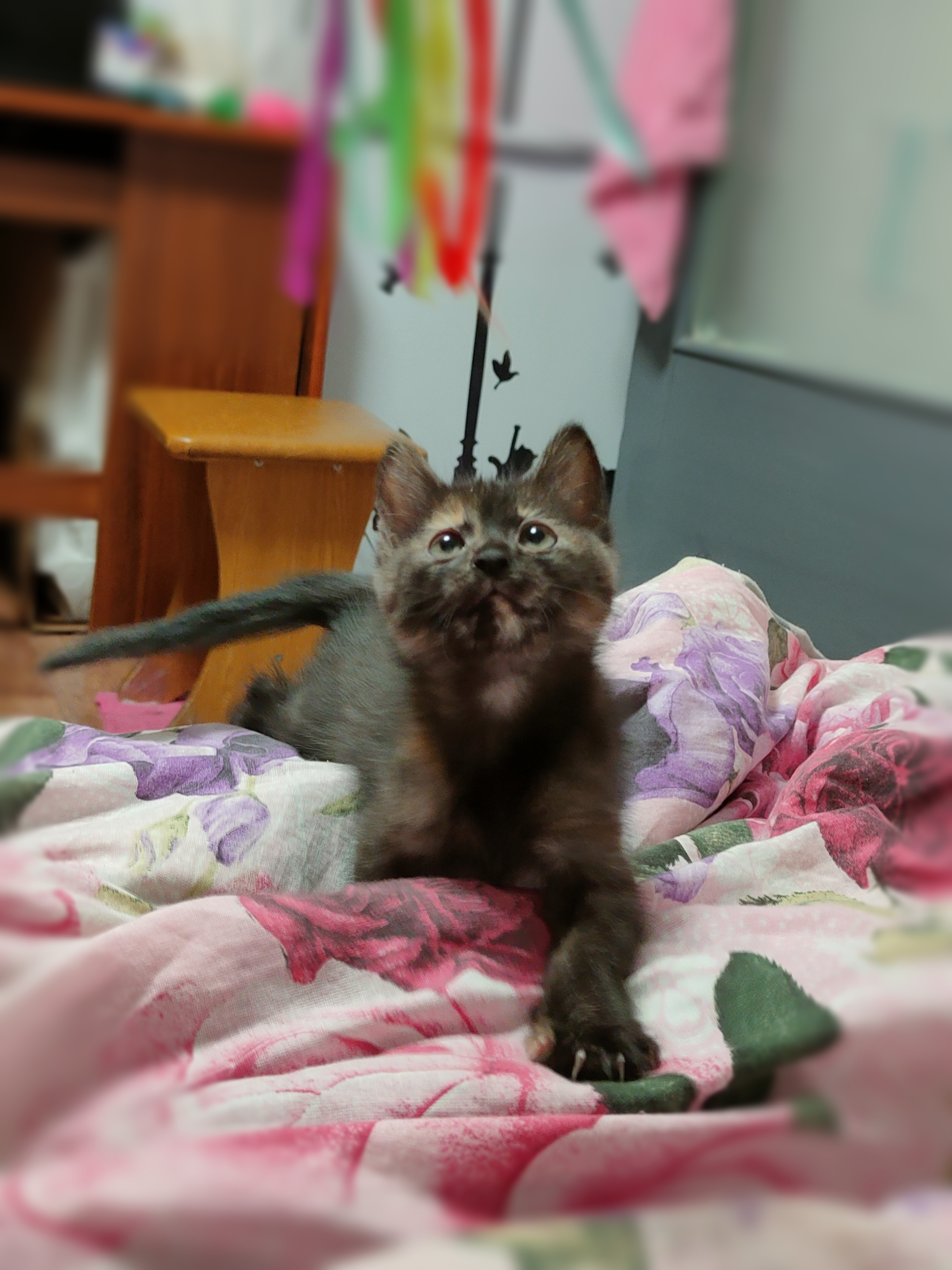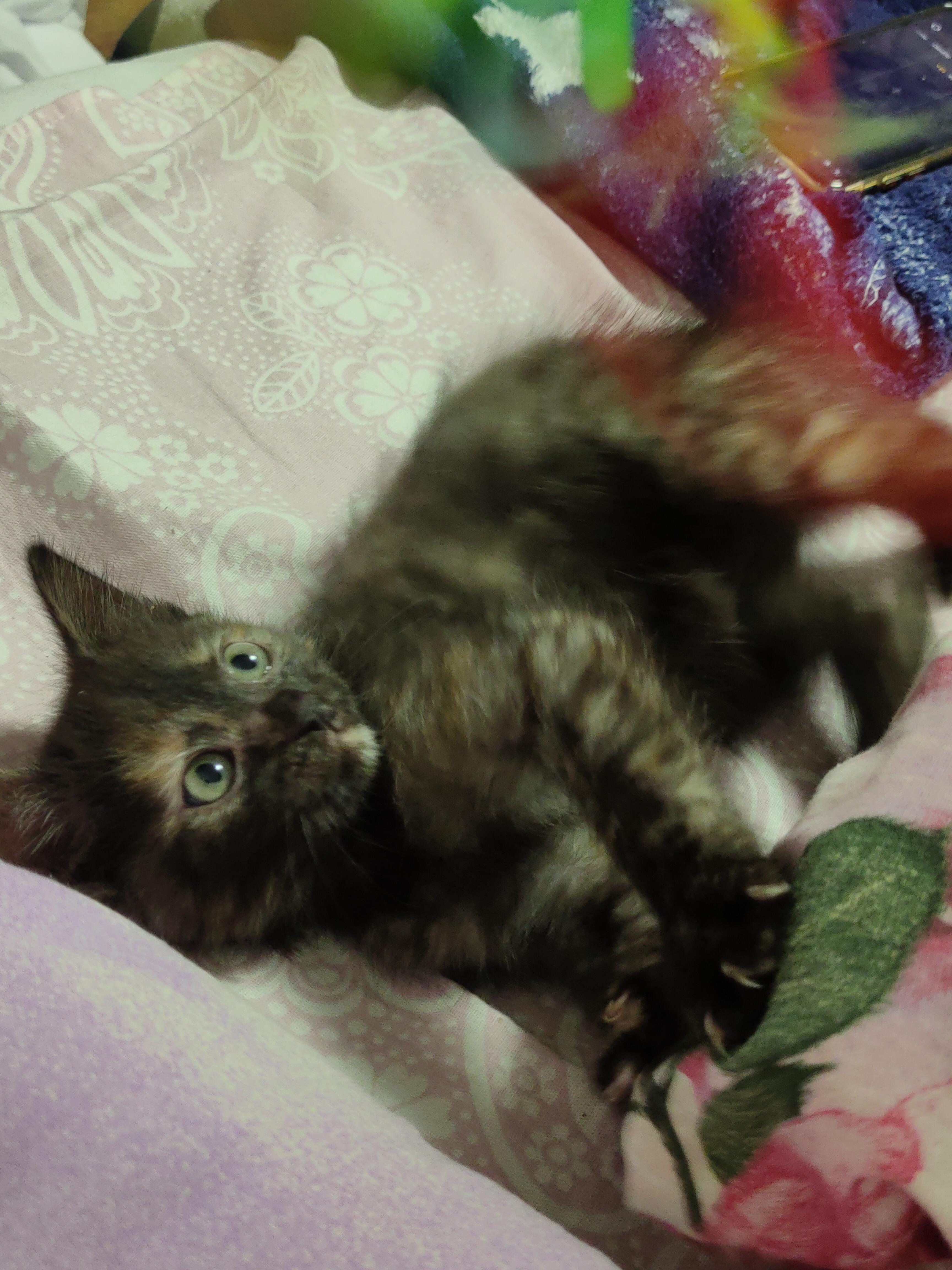 Ищем любящие руки для котёнка, девочка, 2 месяца, средне шерстный черно-рыжий белый, вес ~900 грамм.Питание: сухой корм, консервированный, домашняя еда, непереносимость к лактозе. Обработана от блох, лоток на ура, очень игривая и ласковая.