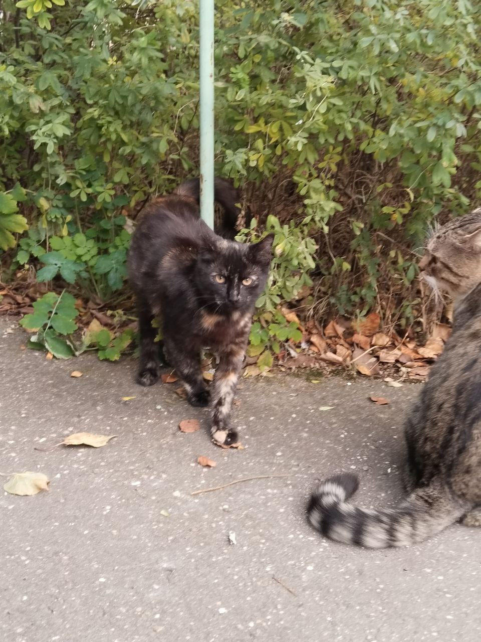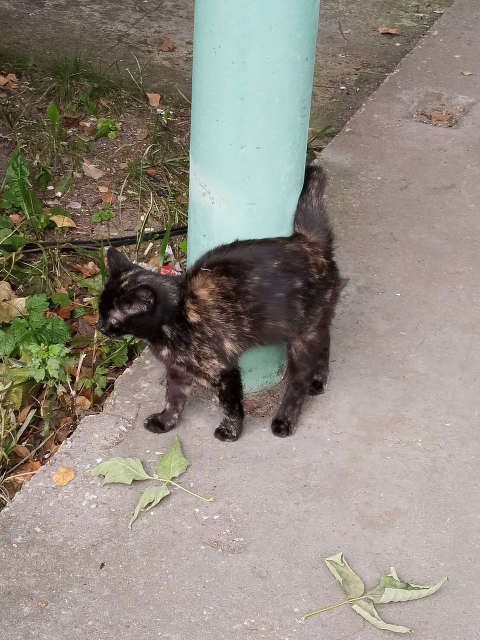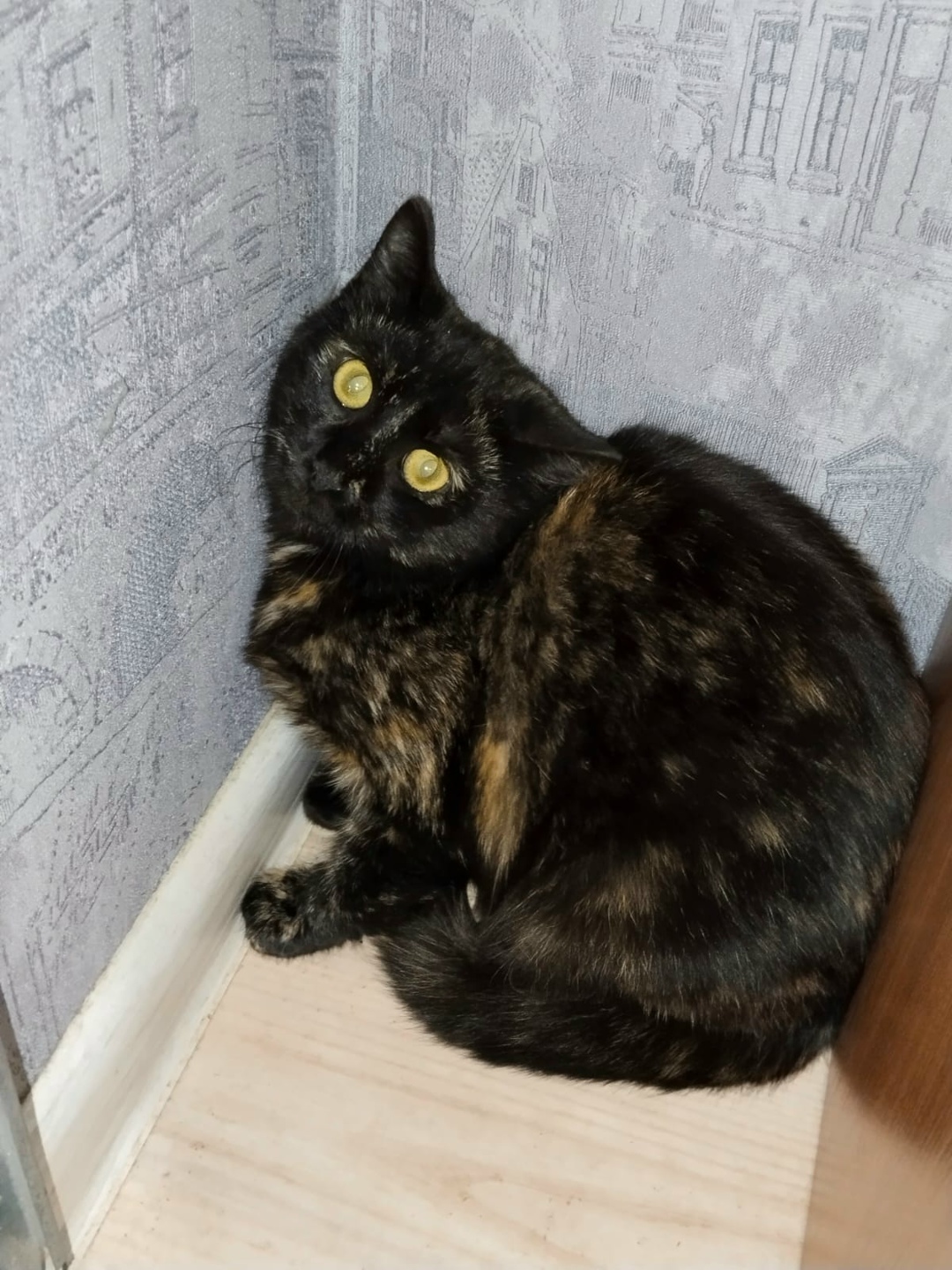 Окрас черепаховый, необычный. Кошка дикарочка, боится человека до чертиков, прячется, если сильно напугана, может цапнуть, в определенных обстоятельствах ее можно погладить и подержать на руках, но она пока этому не рада. Боится резких движений и громких звуков.