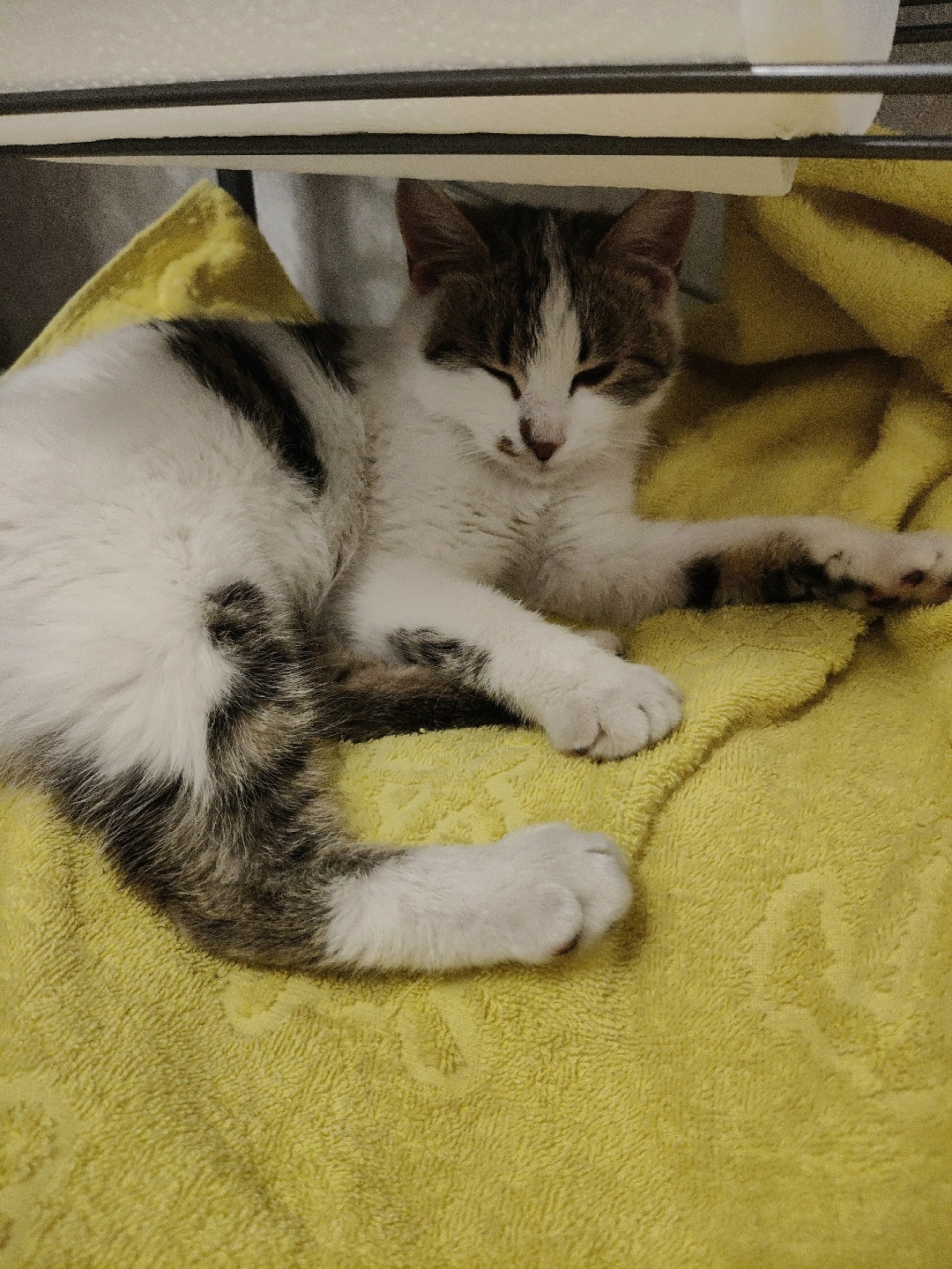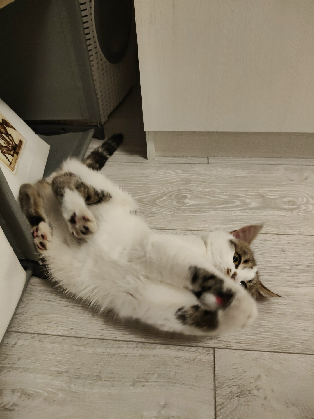 Котик мальчик (около 4 месяцев ему), очень ласковый нашла на улице на морозе в г Старый Оскол. В горшок пошёл сразу кушал мягкий корм. С детками будет играть точно. Мурлыка милый))