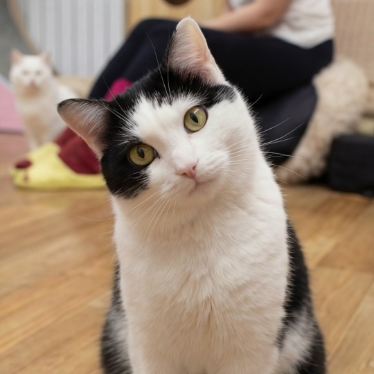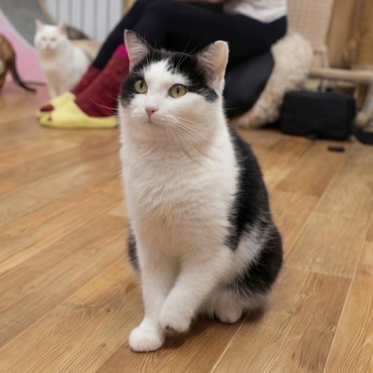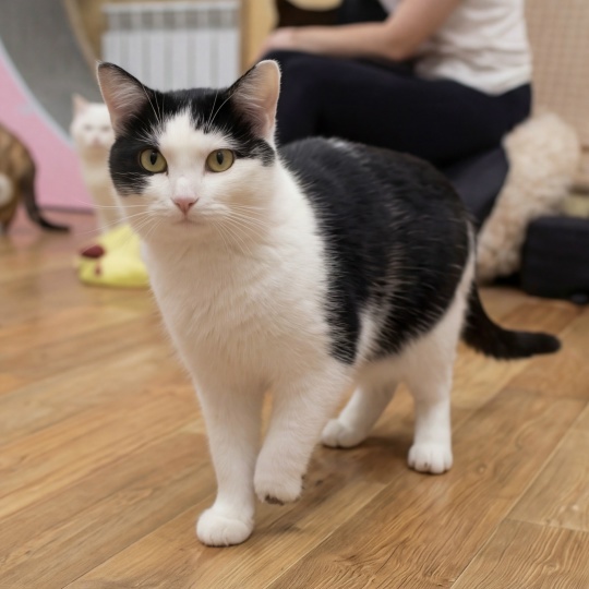 Обаятельный котик с «особенной комплектацией». На одной передней лапке нет пальчиков, и он ловко этим пользуется. Чуть заметит внимание, поднимает лапку, делает несчастный вид и идёт собирать поглаживания и вкусняшки. Как только зрители исчезают, включается режим гонщика и заводилы.