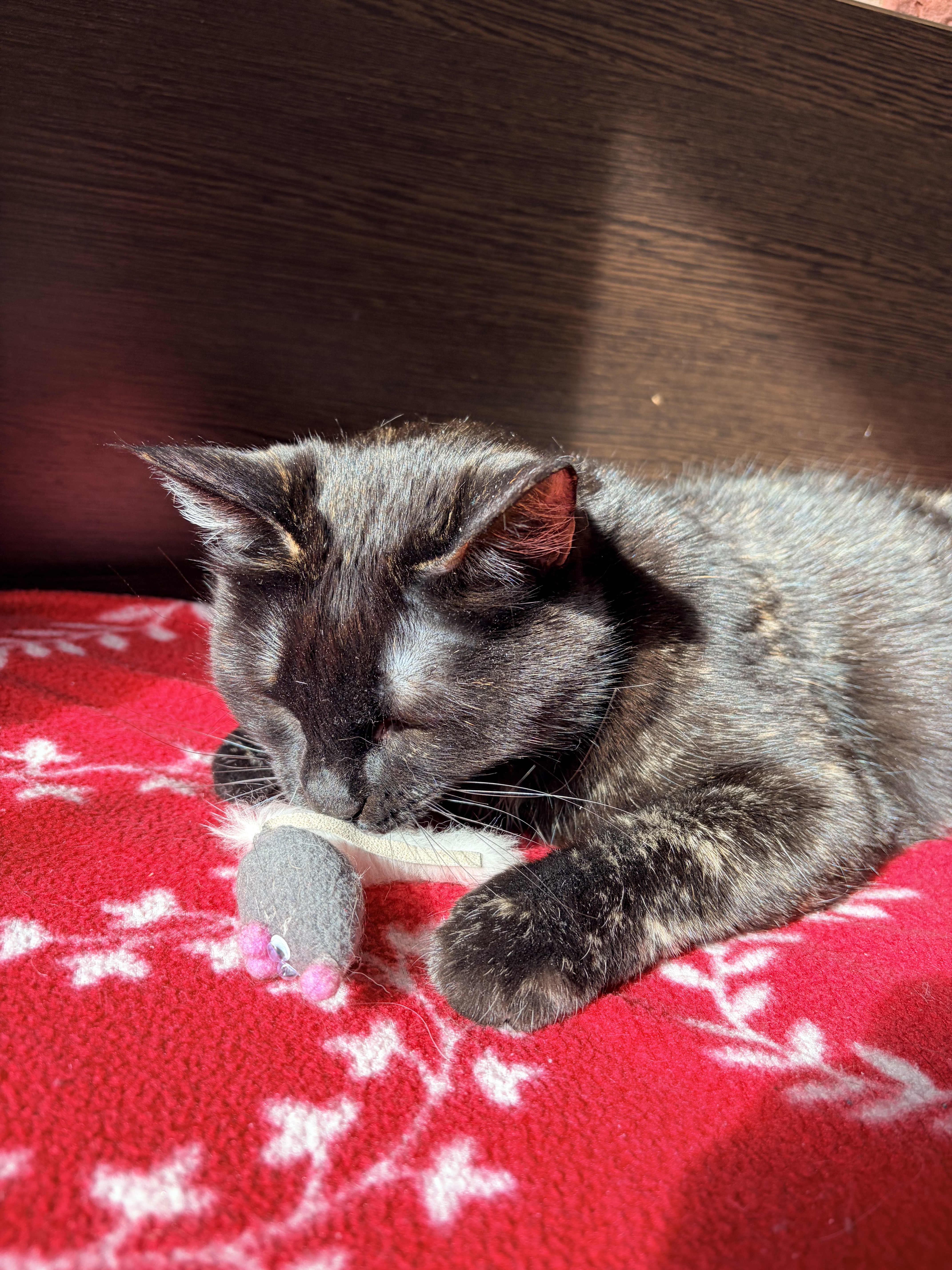 У меня нет проблем со здоровьем, я кушаю сухой корм для стерилизованных кошек и могу иногда побаловаться пакетиком влажного корма. Люблю гладиться и мурчать своему компаньону. Мои любимые игрушки - мышки, и я очень тихая кошка, почему меня так и назвали.