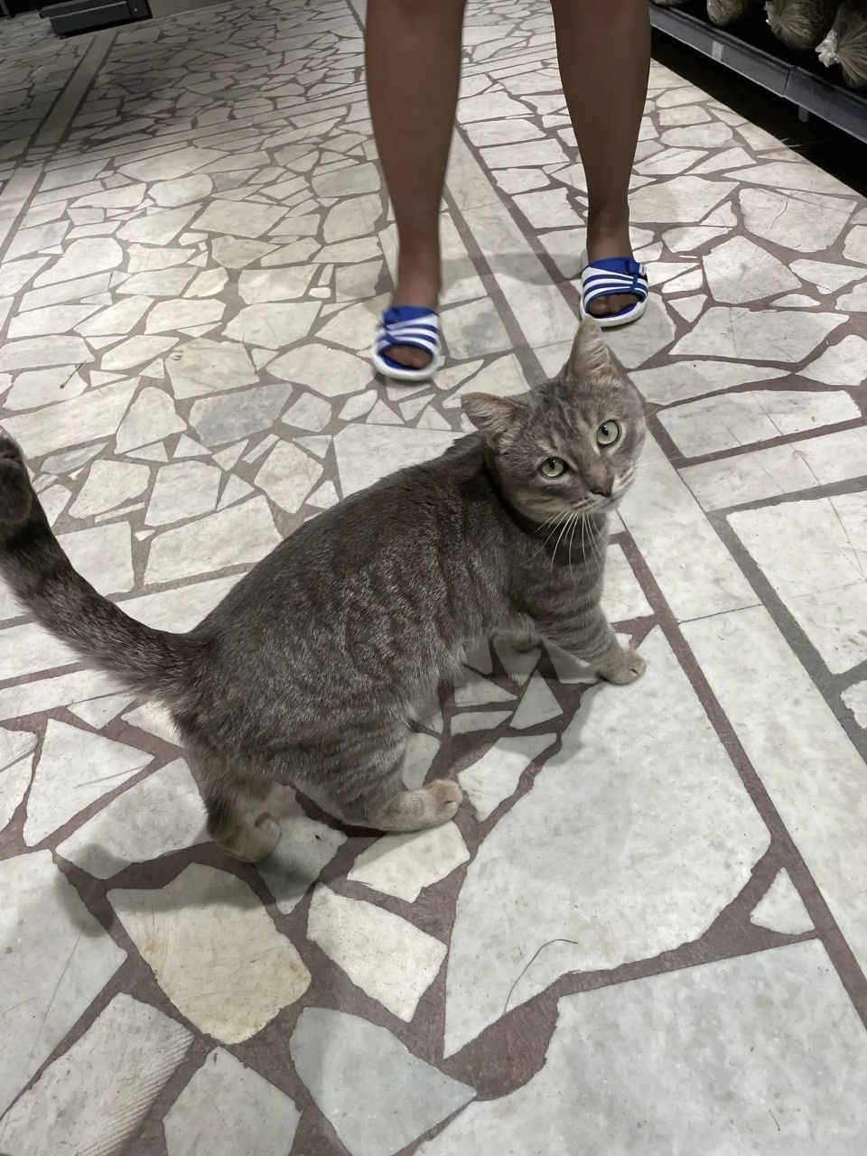 Днём кот приходит в магазин согреться и отоспаться. На ночь вынуждено отправляется вновь на улицу.