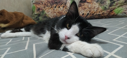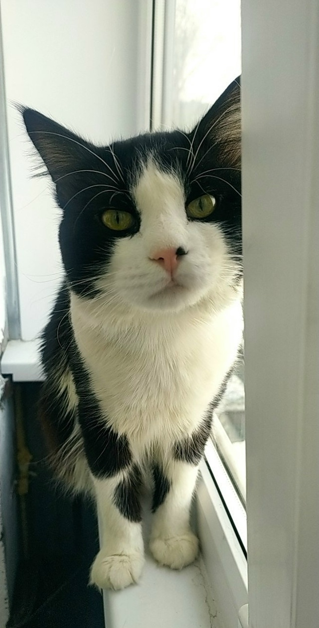 Русе 12 месяцев. Он родом из Сочи — в возрасте двух месяцев его спасли с улицы и привезли в Челябинск. Это крупный, красивый черно-белый кот с выразительными желто-зелеными глазами.