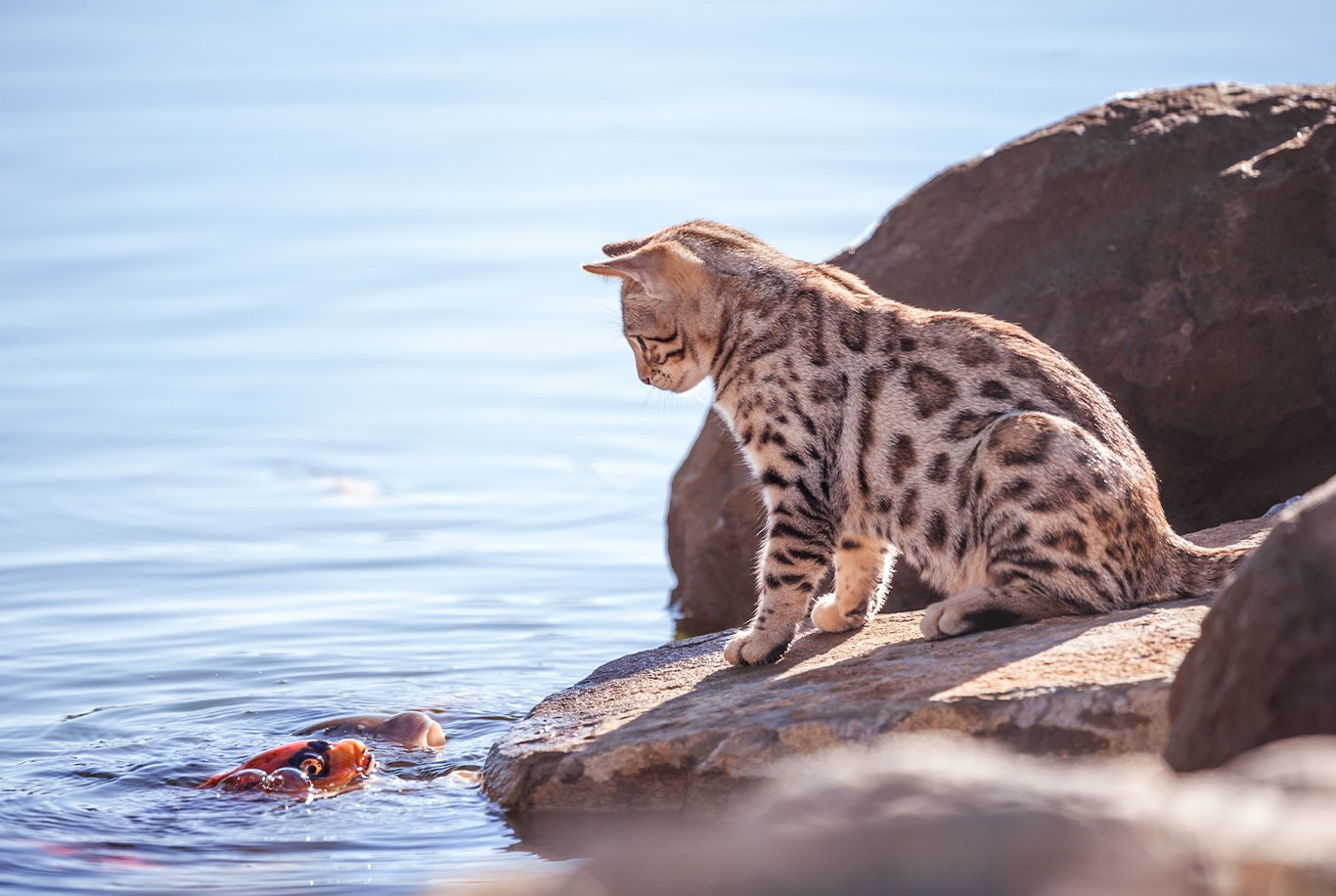 Бенгалы — это результат скрещивания домашней кошки и дикого азиатского леопардового кота. От своих предков они унаследовали не только эффектный «леопардовый» окрас, но и любовь к воде. В дикой природе их сородичи часто охотятся в реках и ручьях.